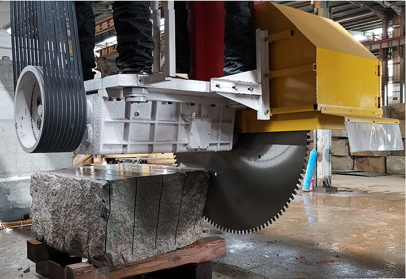 石材龙门多片组合锯,大型荒料切割机,是原石加工成板材的切石设备。本机电控采用西门子配置,质量稳定性好,自动化性能高。主轴升降采用6根圆柱做导轨,保证整机结构稳定,升降平稳。